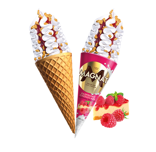 Net weight: 140 g (g)Ingredients: drinking water, wafer cone  14% (premium wheat flour, drinking water, sugar, coconut oil, wheat fibre, soy lecithin emulsifier, table salt, natural food colouring sugar colour III, flavouring), raspberry filling 11% (sugar, glucose-fructose syrup, apple puree, raspberry puree 10%,  drinking water, modified corn starch stabiliser, concentrated apple juice, acidity regulators (citric acid, malic acid, sodium dihydrogen citrate), flavouring, stabiliser mixture (sodium alginate, pectin), natural food colourings (black carrot extract, carmine)), sugar, coconut oil, skimmed milk powder, confectionery glaze (coconut oil, sugar, cocoa powder, soy lecithin emulsifier, flavourings), raspberry filling 5% (sugar, raspberries 35%,  drinking water, stabilisers (modified corn starch, pectin), citric acid acidity regulator, flavouring,  natural carmine food colouring), sugar cookies 1% (premium wheat flour, sugar, coconut oil, glucose syrup , invert syrup (sugar), table salt, raising agents (ammonium bicarbonate, sodium bicarbonate), soy lecithin emulsifier, natural food colouring sugar colour III, flavourings), mixture of stabilisers and emulsifiers (mono- and diglycerides of fatty acids, locust bean gum, guar gum, carrageenan), cheesecake flavouring. May contain traces of peanuts and nuts. GMO-free.