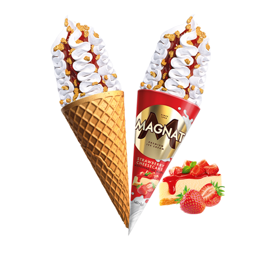 Net weight: 140 g (g)Ingredients: drinking water, wafer cone  14% (premium wheat flour, drinking water, sugar, coconut oil, wheat fibre, soy lecithin emulsifier, table salt, natural food colouring sugar colour III, flavouring), strawberry filling 11% (sugar, pureed strawberries 20%,  drinking water, pectin stabiliser, citric acid acidity regulator, strawberry flavouring,  natural carmine food colouring), sugar, coconut oil, skimmed milk powder, confectionery glaze (coconut oil, sugar, cocoa powder, soy lecithin emulsifier, flavourings), strawberry filling 5% (sugar, strawberry fruit 45%,  drinking water, stabilisers (modified corn starch, pectin), acidity regulator citric acid, strawberry flavouring, natural carmine food colouring), sugar cookies 1% (premium wheat flour, sugar, coconut oil, glucose syrup, invert syrup (sugar), table salt, raising agents (ammonium bicarbonate, sodium bicarbonate), soy lecithin emulsifier, natural food colouring sugar colour III, flavourings), a mixture of stabilisers and emulsifiers (mono- and diglycerides of fatty acids, locust bean gum, guar gum, carrageenan), cheesecake flavouring. May contain traces of peanuts and nuts. GMO-free.